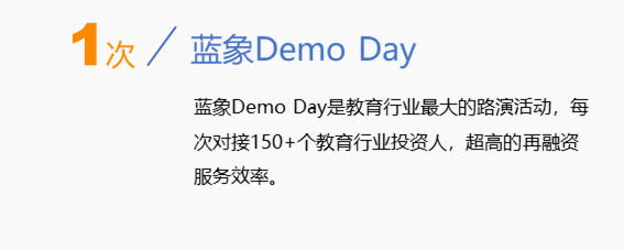 藍象資本是專注教育領域的早期基金,項目按照1000萬元估值投資30或80萬元。每年2期“藍象營”加速計劃,每期持續(xù)6個月。